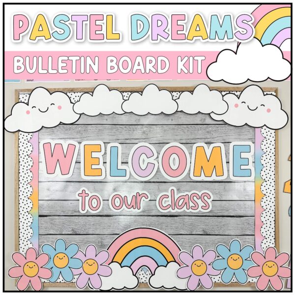 Decorate your classroom for Back to School with this dreamy, pastel back to school bulletin board kit! This bulletin board matches my Pastel Dreams Classroom Decor. Decorate for the beginning of the year with this bulletin board idea or classroom display. These printable calming, soft designs include ideas for rainbows, clouds, daisies, phrases, bunting, borders and editable student names (through PowerPoint with the fonts embedded).