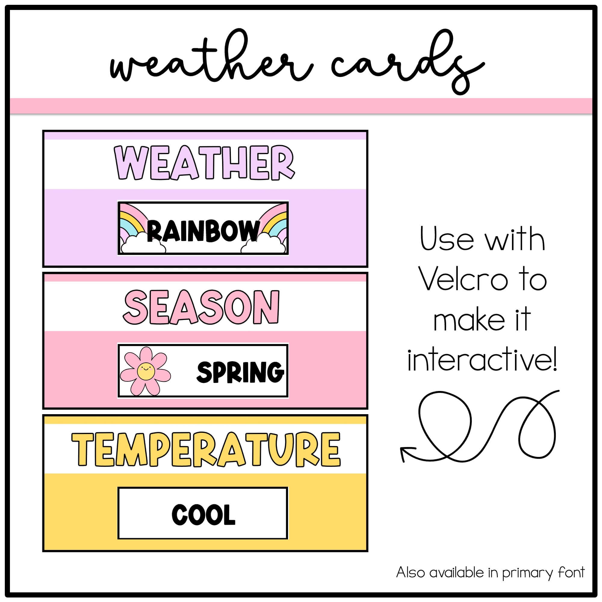 This classroom calendar and weather display is perfect for your pastel, calm classroom decor. The printable calendar has a simple, rainbow, cloud design. The calendar template will match your colorful classroom! This text editable calendar is perfect to put in your calendar pocket chart or staple/velcro to a bulletin board. This printable classroom calendar includes interactive displays for weather, season, temperature and yesterday/today/tomorrow. This classroom calendar and weather display includes a funky font and a primary font and is text editable editable through PowerPoint