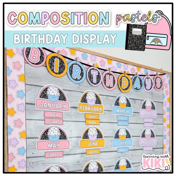 Composition Notebook Birthday Bulletin Board | Pastel Birthday Chart Display | Editable | Adorable Classroom Decor