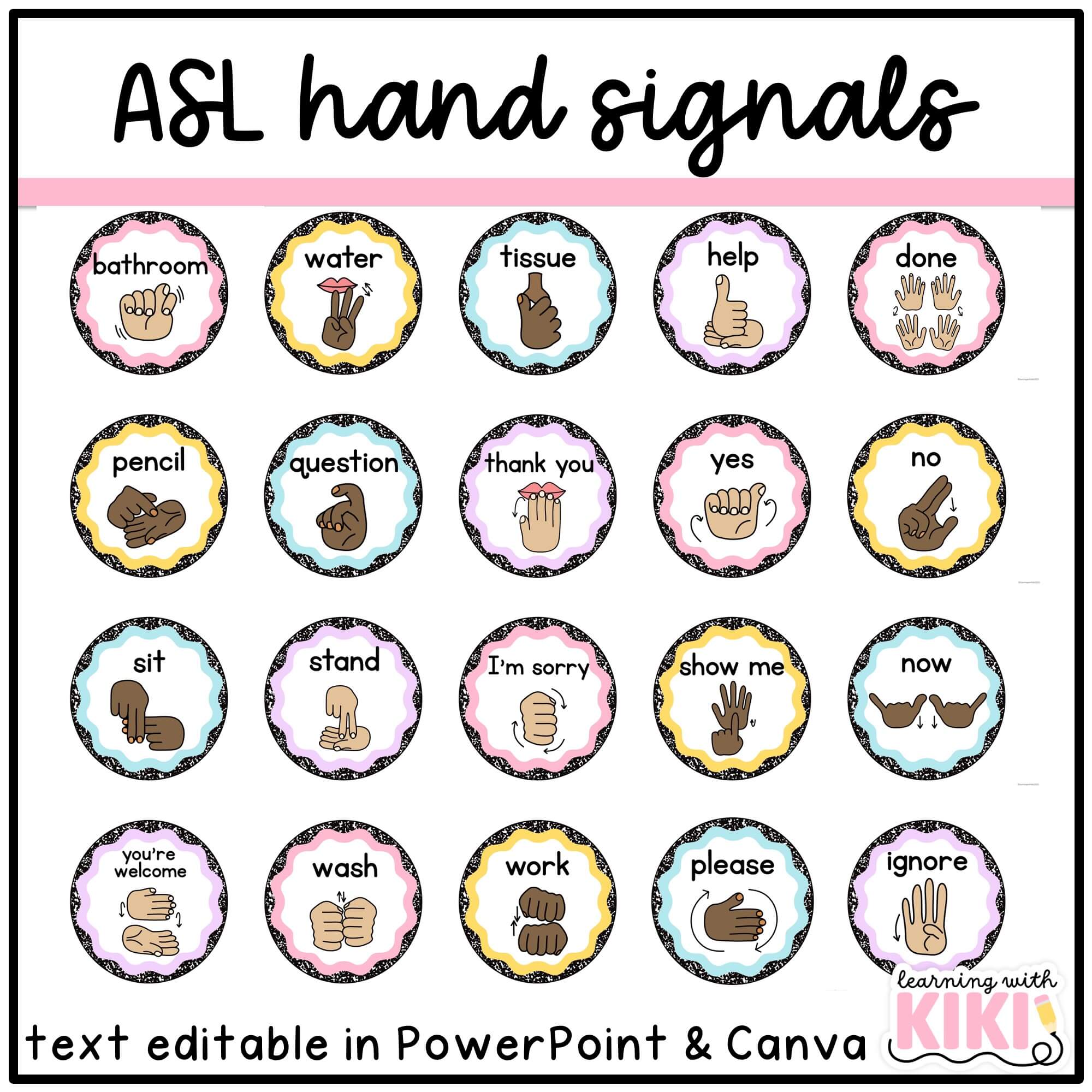 These classroom composition notebook hand signals are perfect for your pastel, calming classroom! The hand sign display includes ASL (American Sign Language) and general gesture hands. The templates are text editable through PowerPoint and Canva with the font embedded. Students are able to nonverbally communicate with these posters, thus reducing disruptions. There are 2 per page and a bigger design with 1 per page. The icons (toilet, water, tissue box, question mark & pencil) are not flattened and the text is editable. You can edit them to match your classroom hand signals.