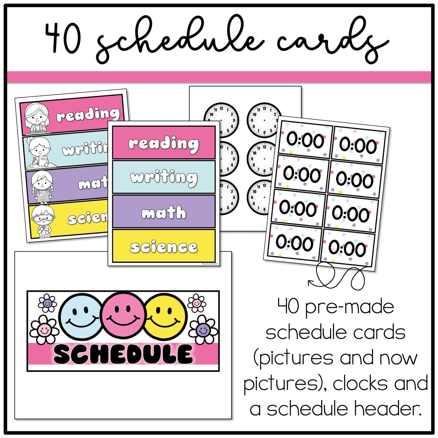 This happy brights daily schedule cards template is perfect for your retro, daisy, smiley face inspired classroom decor! The printables can be edited in PowerPoint with fonts embedded. It includes a schedule with pictures for primary classrooms and without them for middle school and high school. There are 40 pre-made happy brights daily schedule cards that are ready to print. It includes a header and clocks/time boxes.