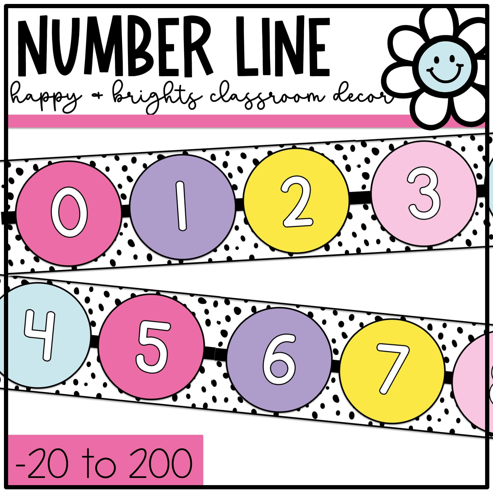 This retro, happy, brights number line is perfect for your colorful classroom decor. The number range includes -20 to 200 on different colored circles.
