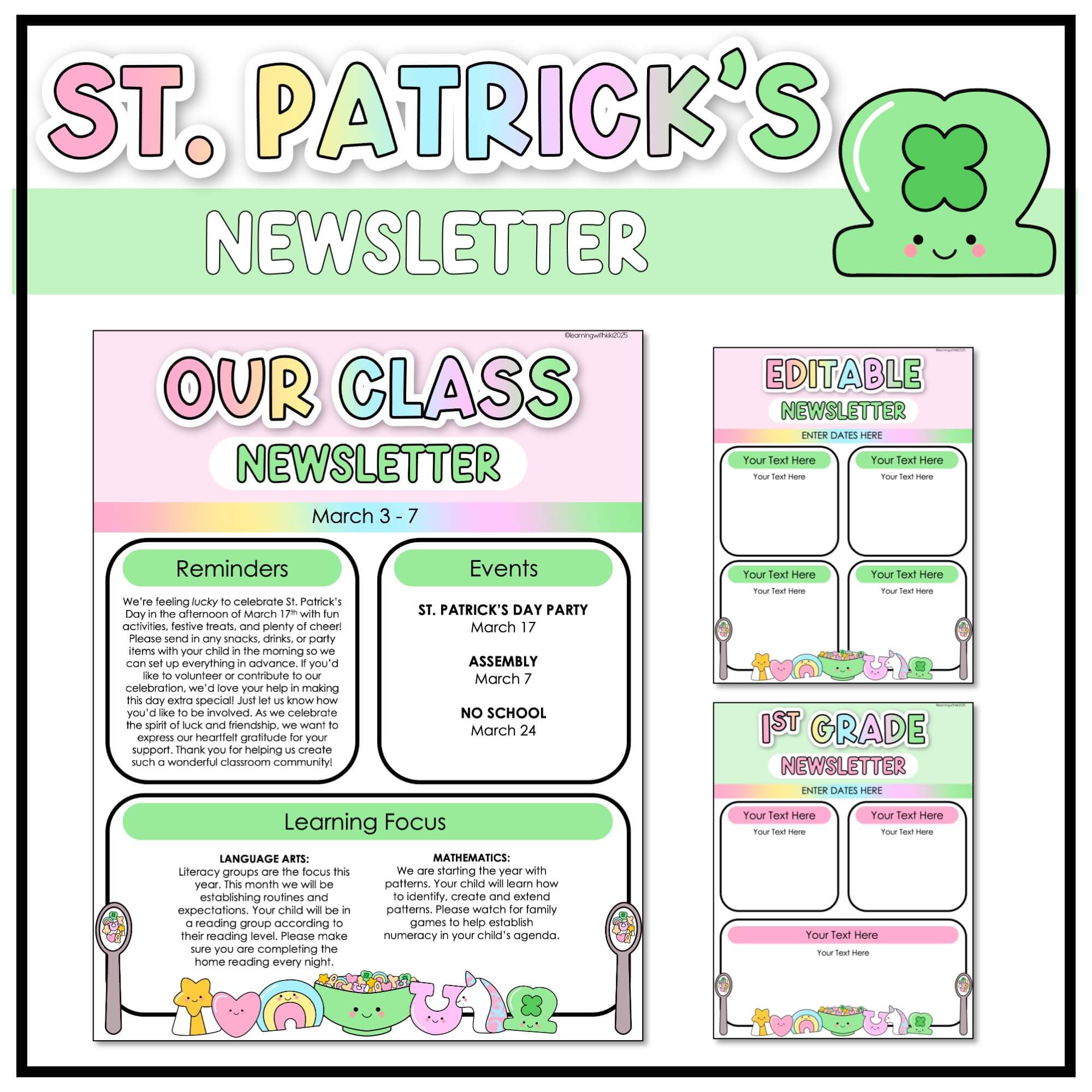 This weekly or monthly editable St. Patrick’s Day Newsletter template is perfect for your trendy, cute classroom! The printable newsletter has an adorable Lucky Charms theme with marshmallows, rainbows, shamrocks and more. There is a ink friendly version included. The template is text editable through PowerPoint and Google Slides. The headers are “locked in” but there is a fully editable version (font embedded in PowerPoint ONLY). This pack now includes a BONUS calendar! I recommend printing one, hanging it outside of your classroom and then sending it digitally to parents to save ink!