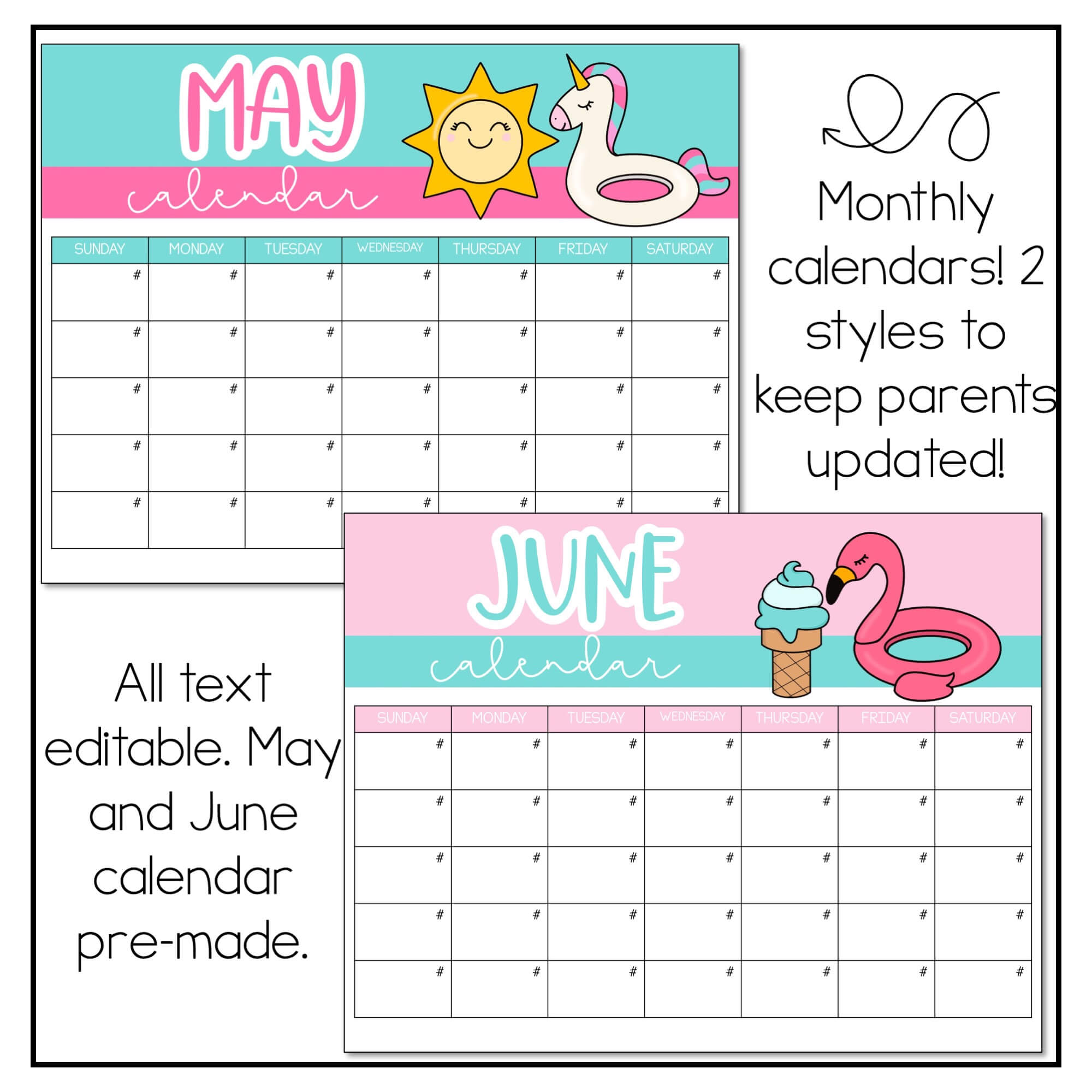 Keep families updated with this Summer Classroom Newsletter! This weekly or monthly editable summer and May and June themed newsletter template is perfect for your trendy classroom! The end of the year printable newsletter has an adorable floatie, sun and pool party design. The template is completely text editable through PowerPoint and the font is embedded. This pack now includes a BONUS calendar! I recommend printing one, hanging it outside of your classroom and then sending it digitally to parents to save ink!
