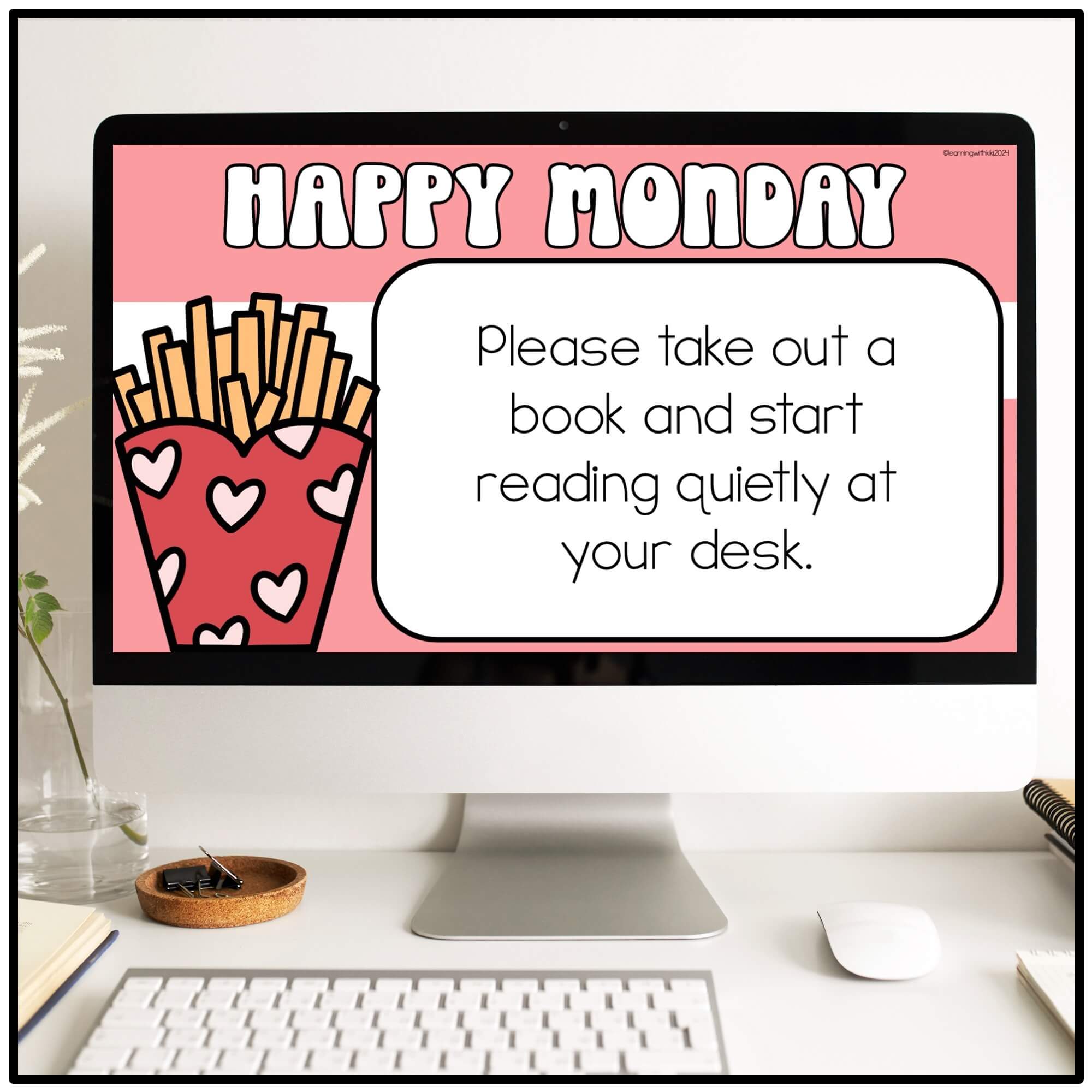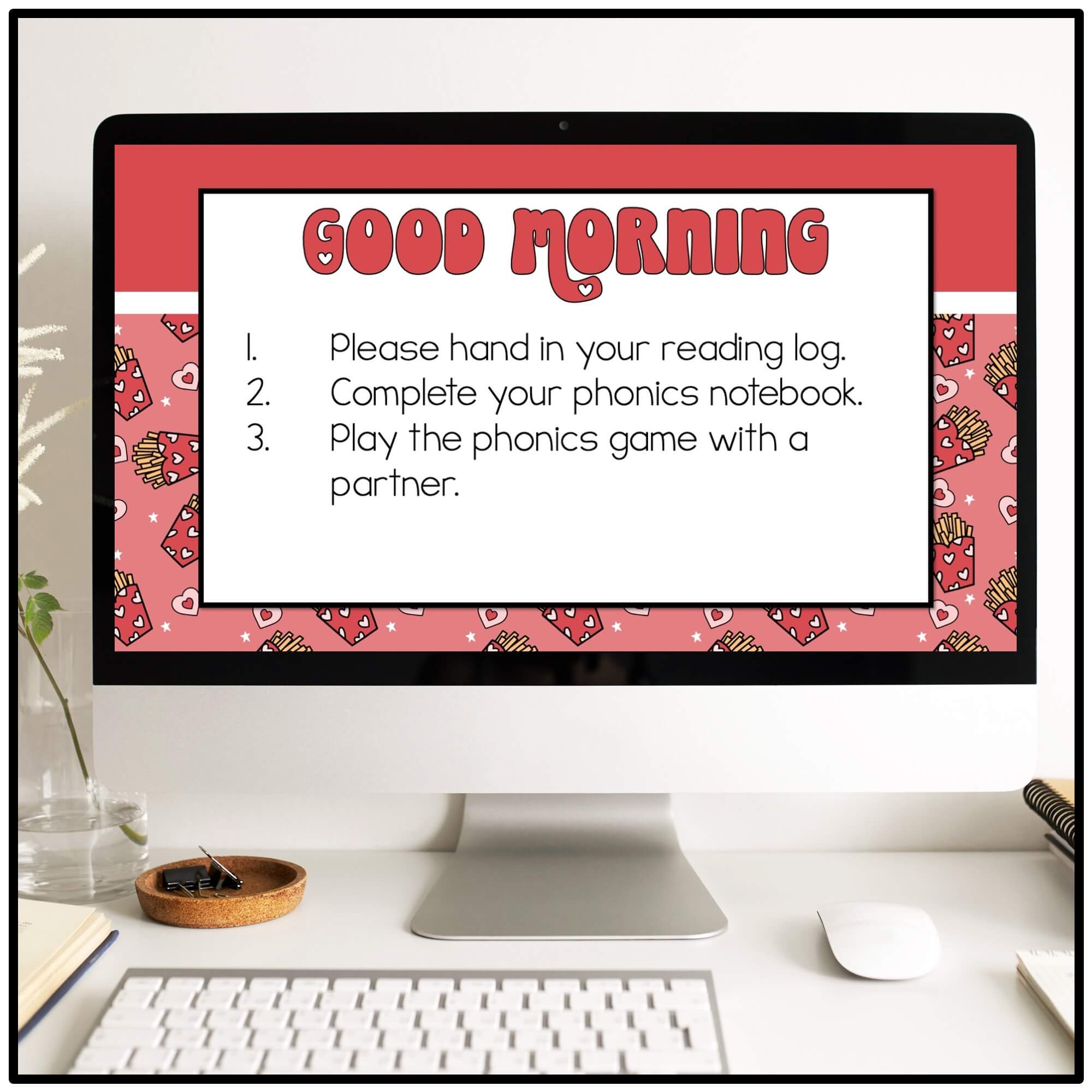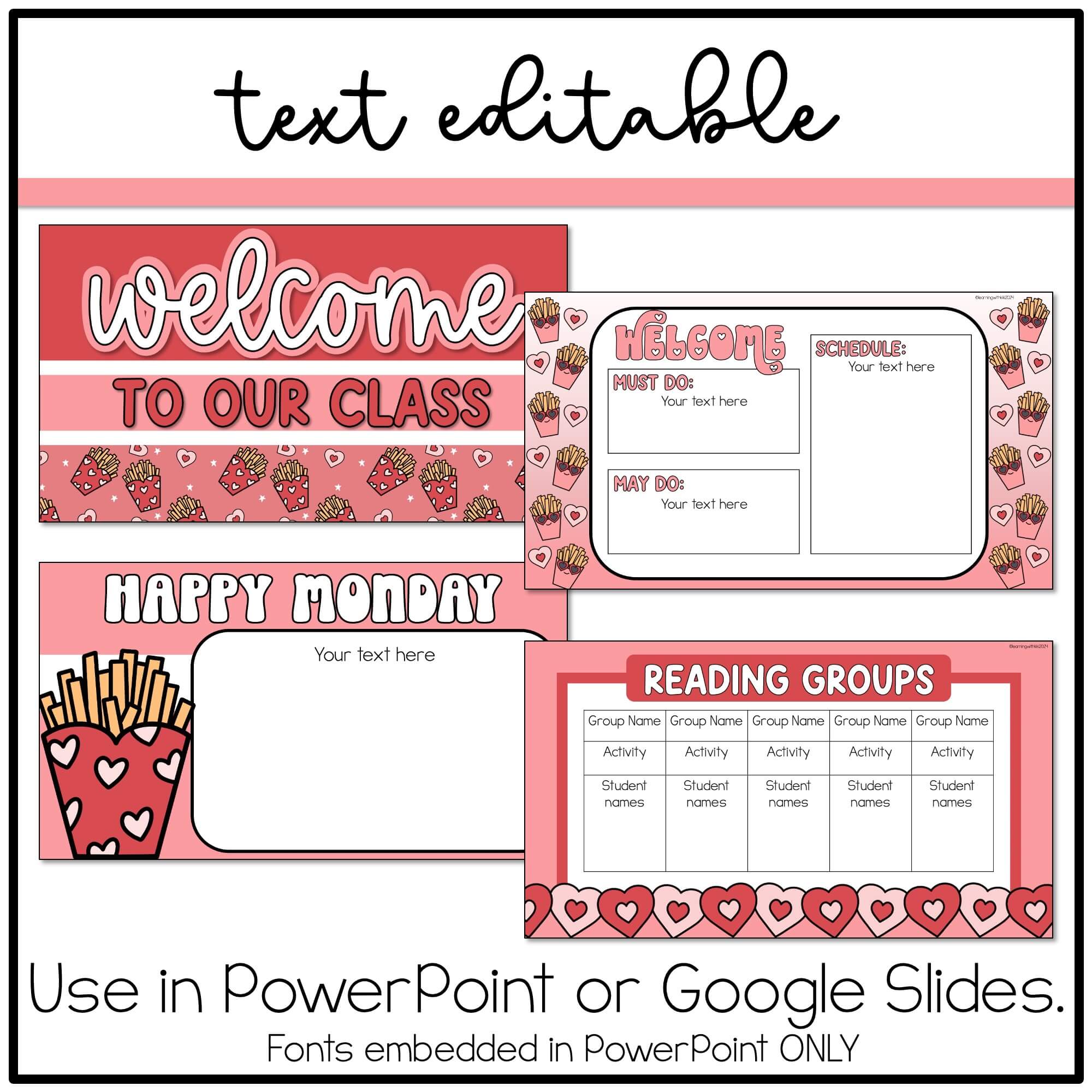 Get ready to be organized with these Valentine’s Day classroom slides templates! These retro slides are editable through Google Slides and Powerpoint to be easily shared through Google Classroom, Seesaw, Classroom Dojo and more. These designs include french fries, hearts and more. These classroom slides also include timers that can be copy and pasted to each slide. Please ensure you have the right software prior to purchasing. These slides are text editable. Font is embedded in the PowerPoint file but you must use a Google font in Google Slides . You will love these Valentine’s Day Classroom Slides!